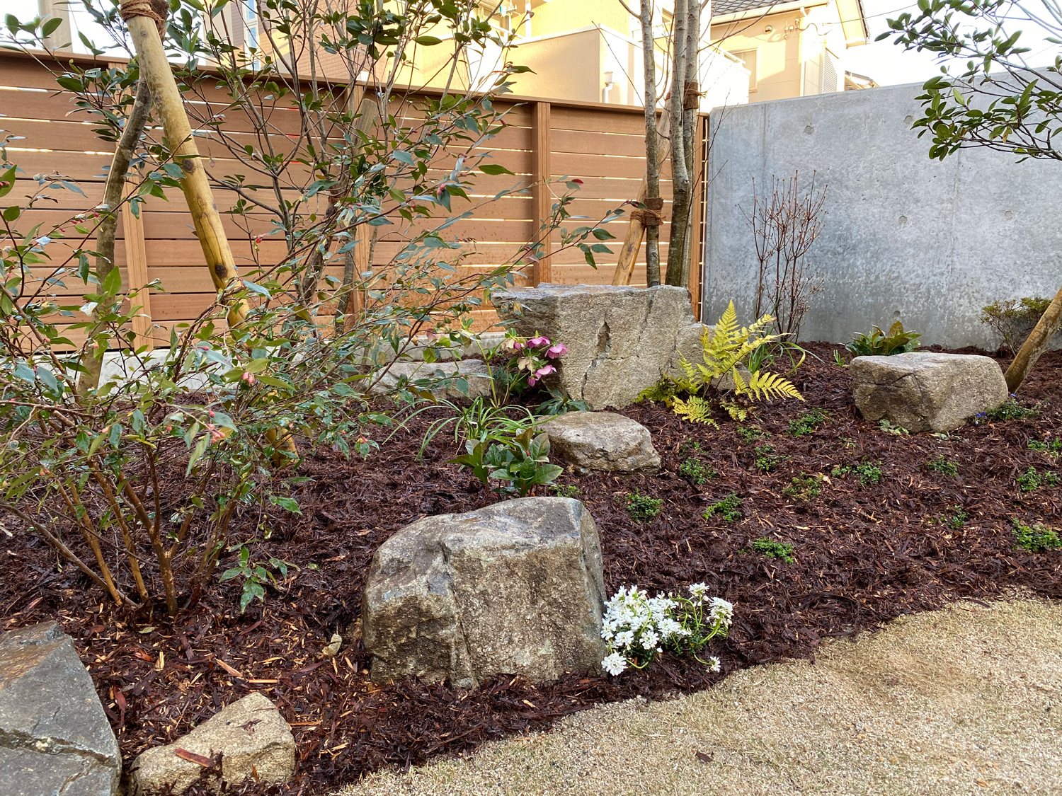 グランドカバーも少し広がっています。お施主様もご自分で花を植えられていて華やかな感じになっていました。