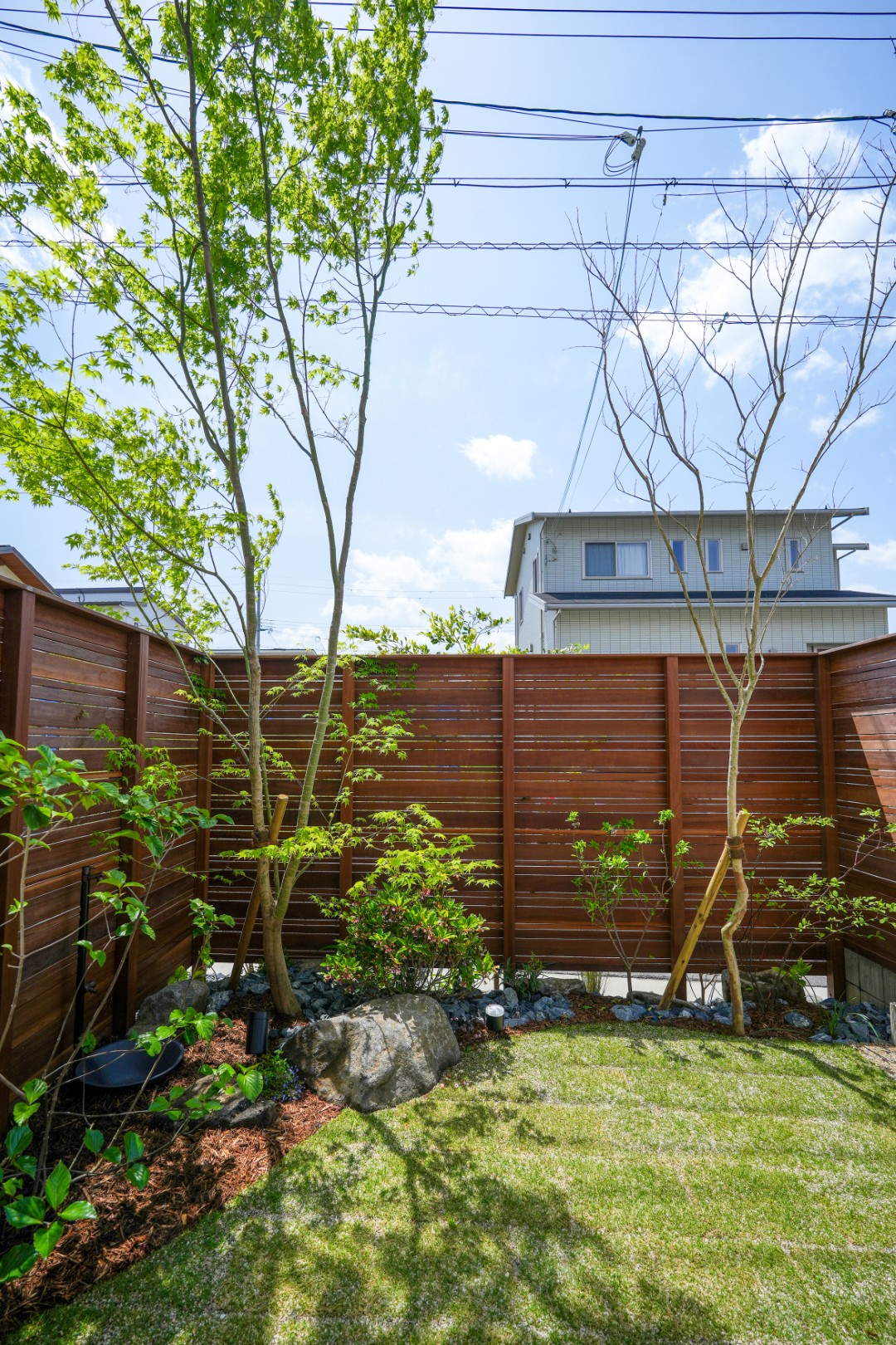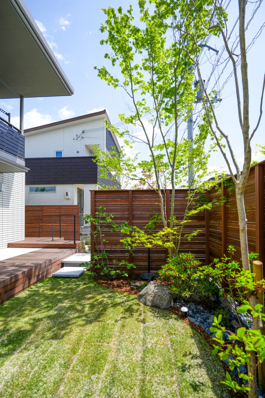 全体の雰囲気は天然木、鉄、石を組み合わせ、緑と調和した経年変化が楽しみな庭空間にしました。植栽も