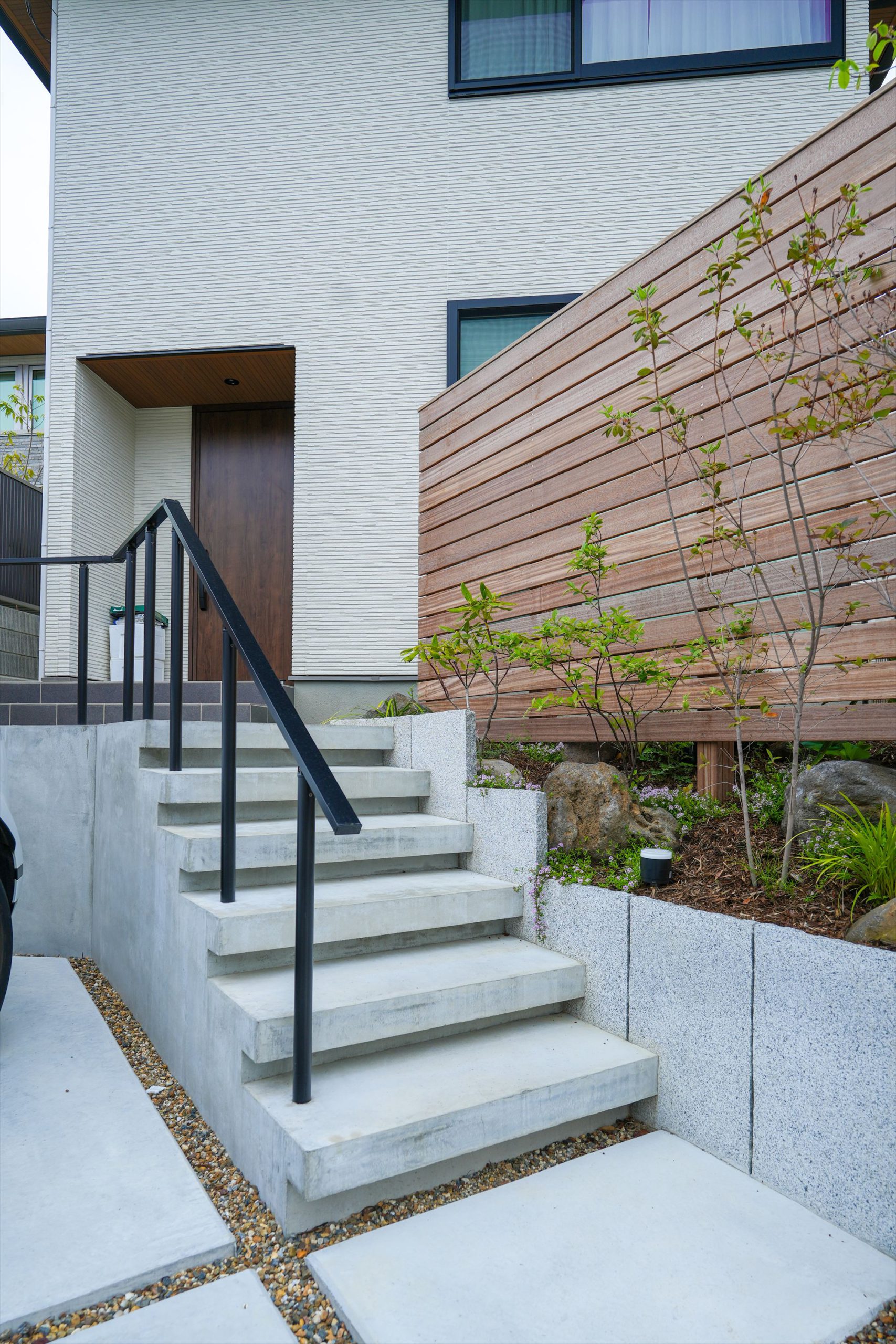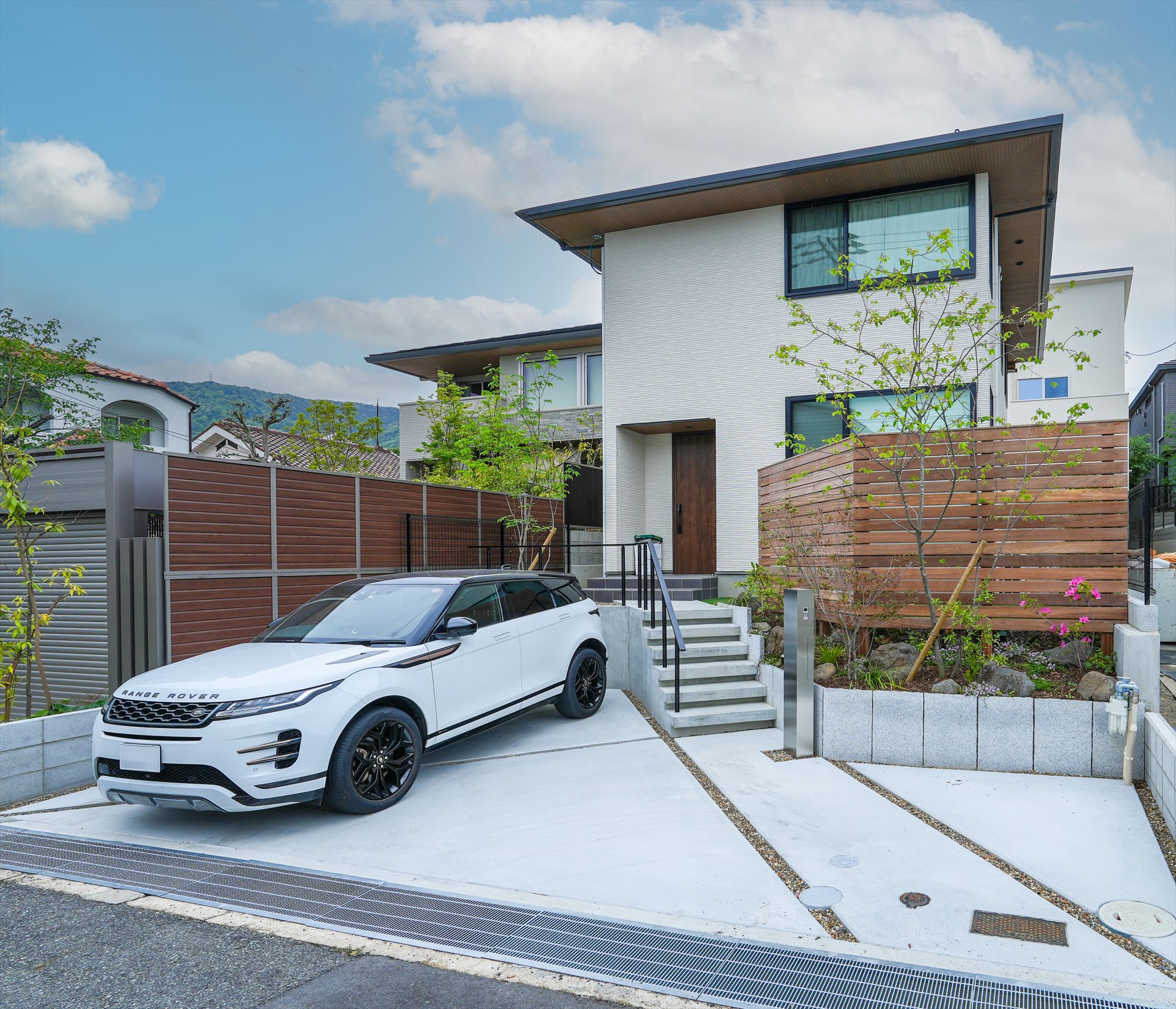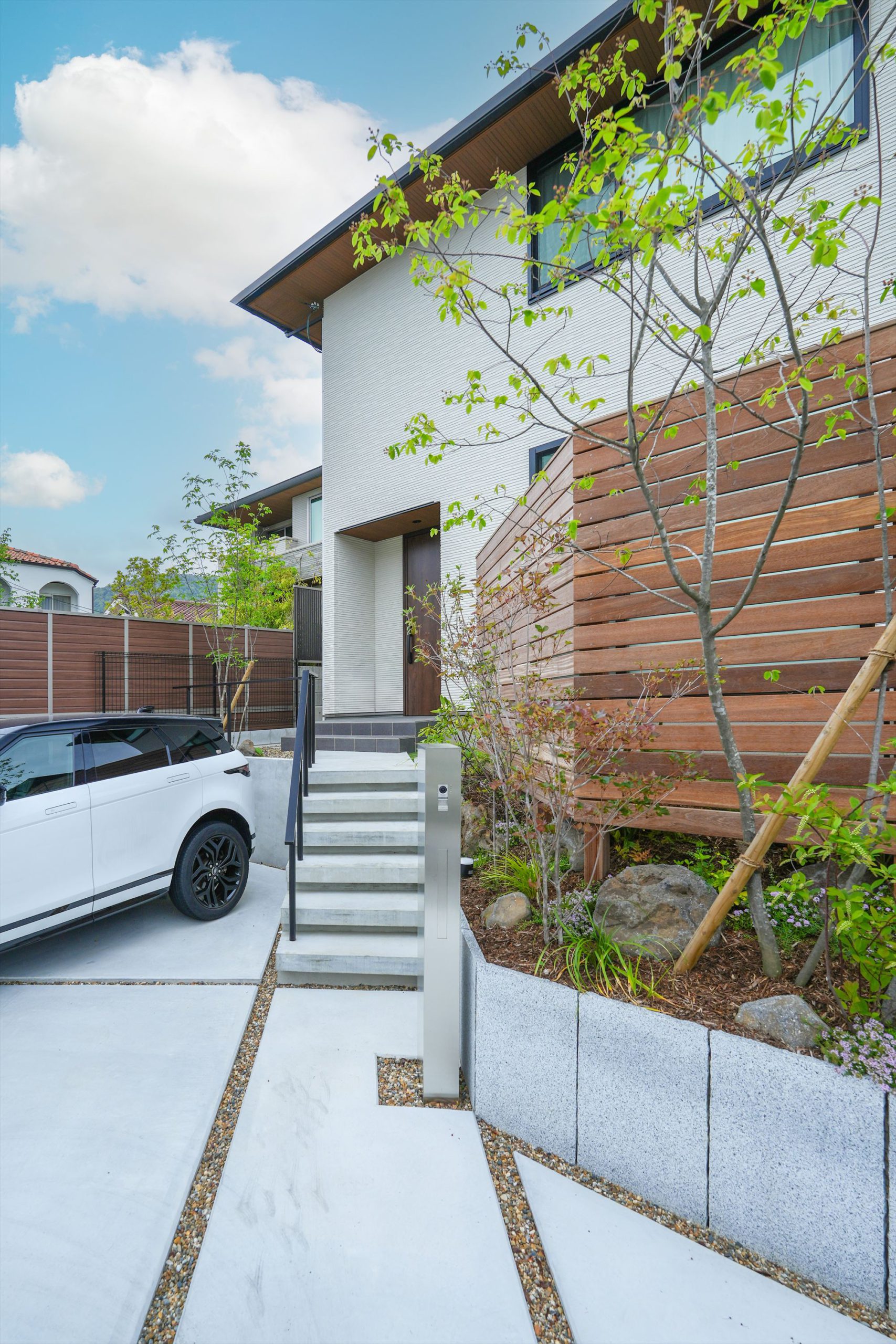 限られた間口の中で、機能性と景観性を両立させるため、外構全体を斜めのラインで構成し、空間に広がりと流れを持たせています。