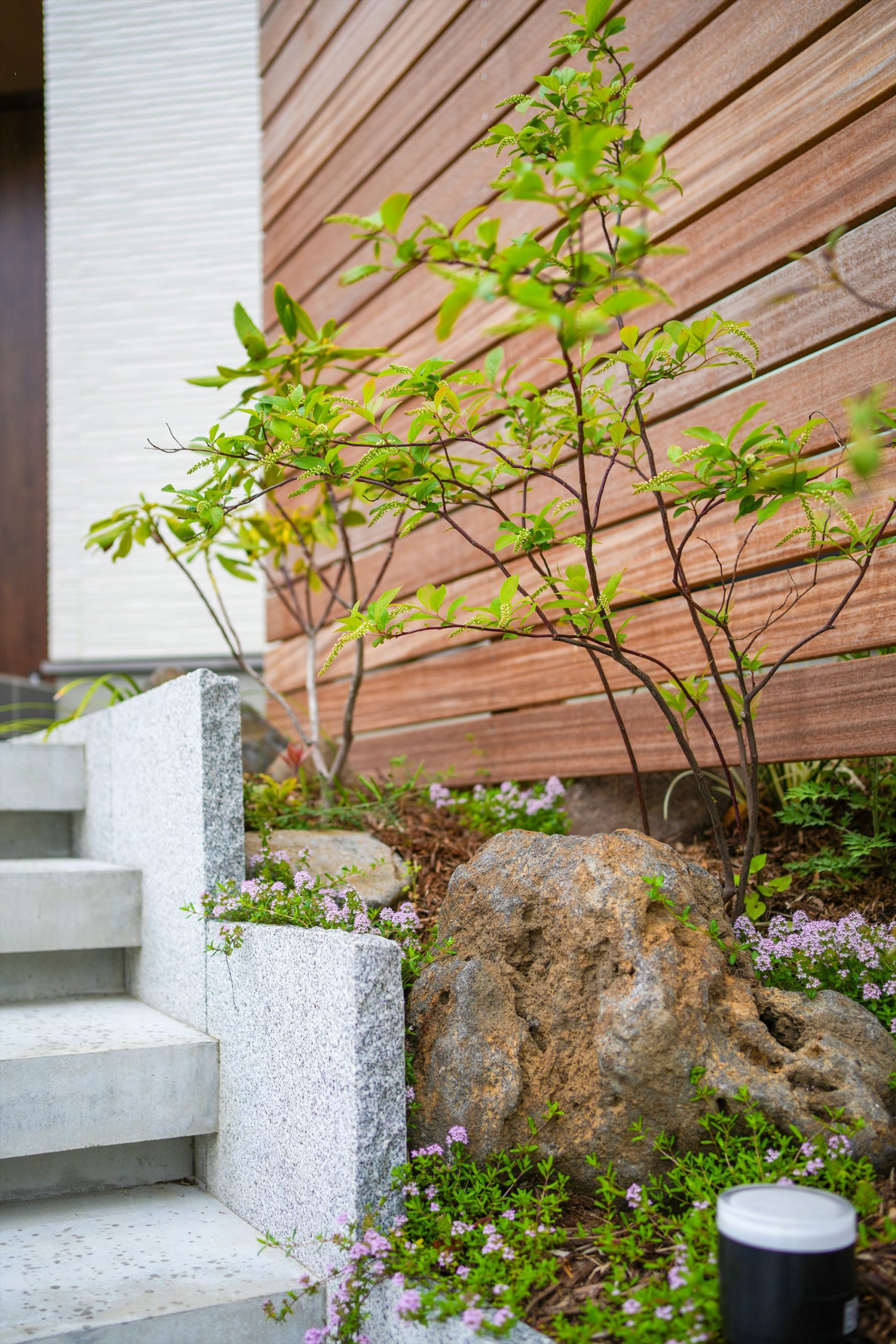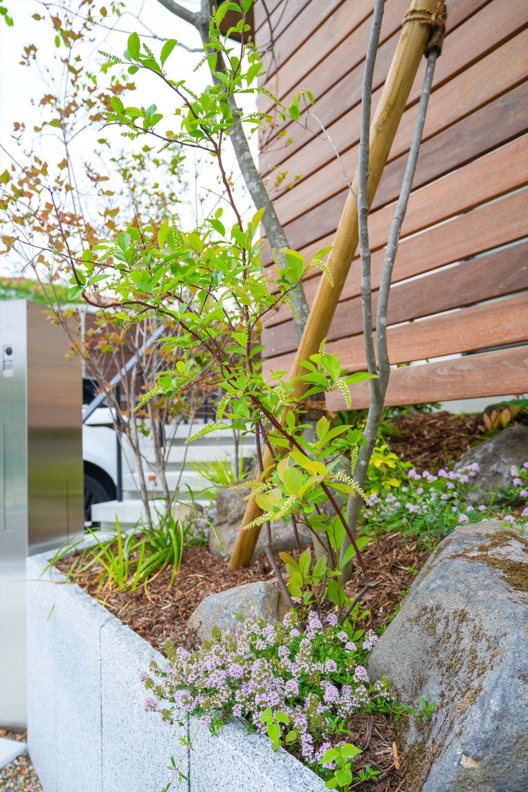 また、視線が交差しやすい駐車スペースと庭の関係性についても、植栽とハードウッドの板塀を組み合わせることで、必要なプライバシーを確保しつつ、閉塞感のない構成としました。