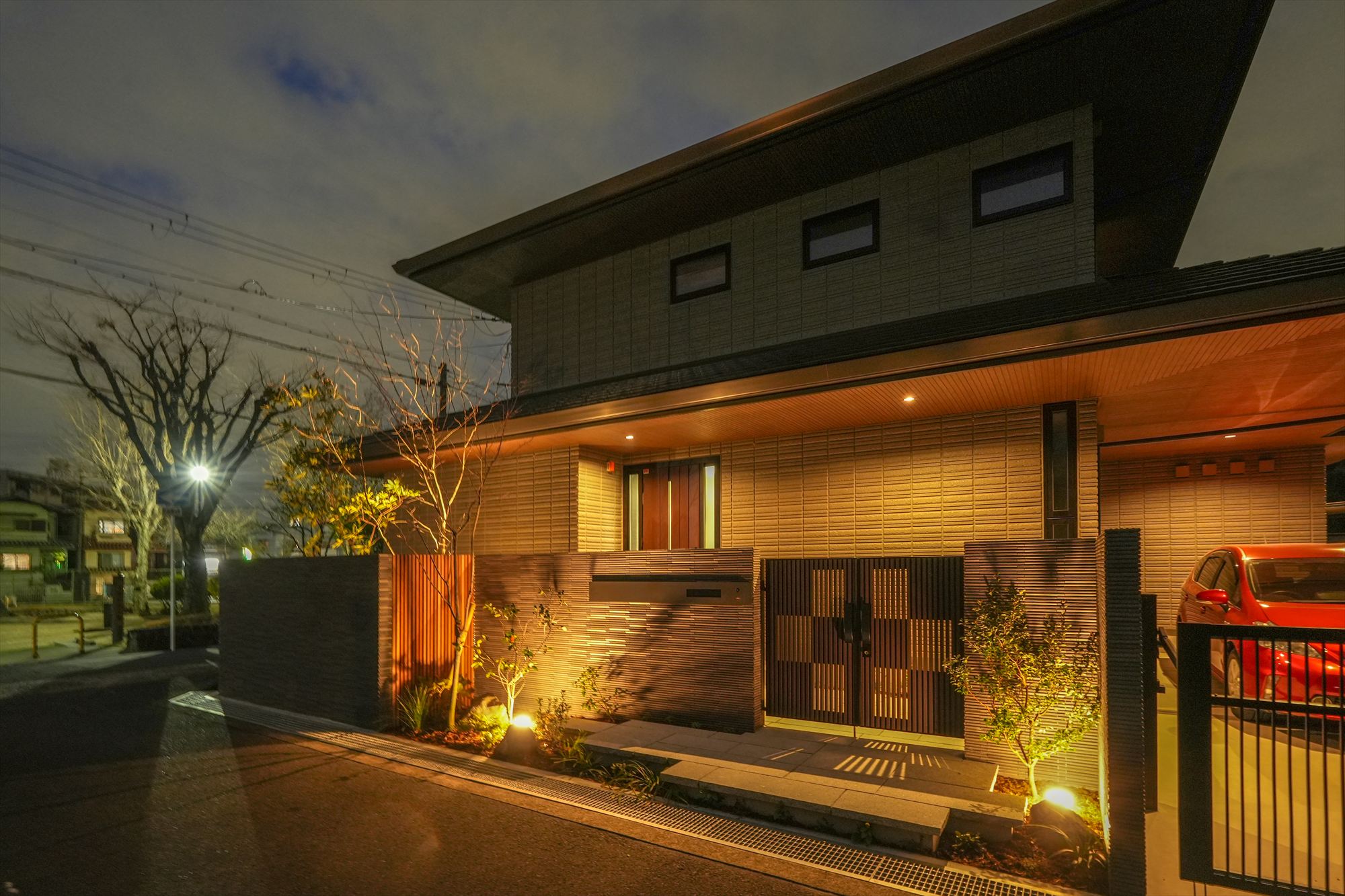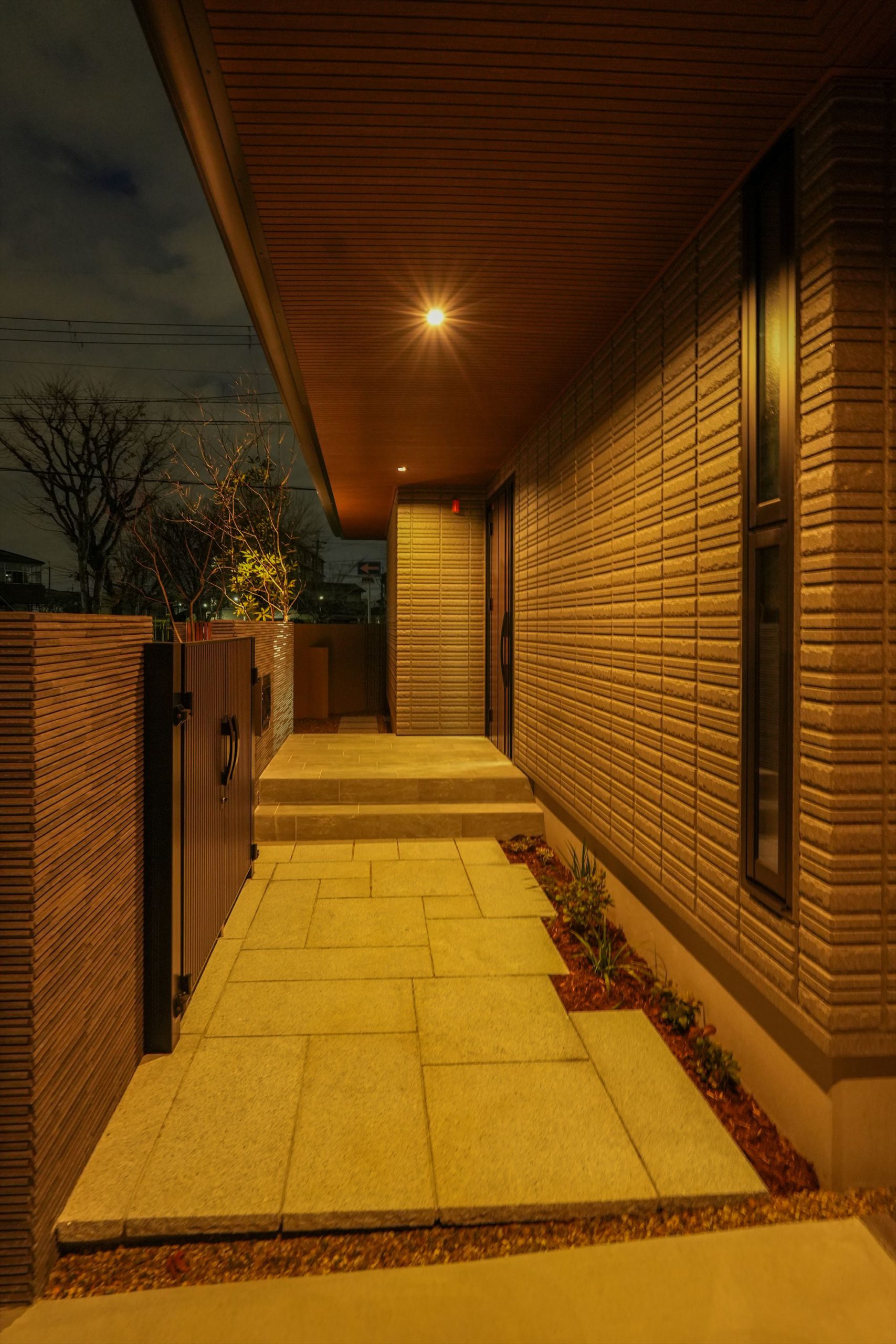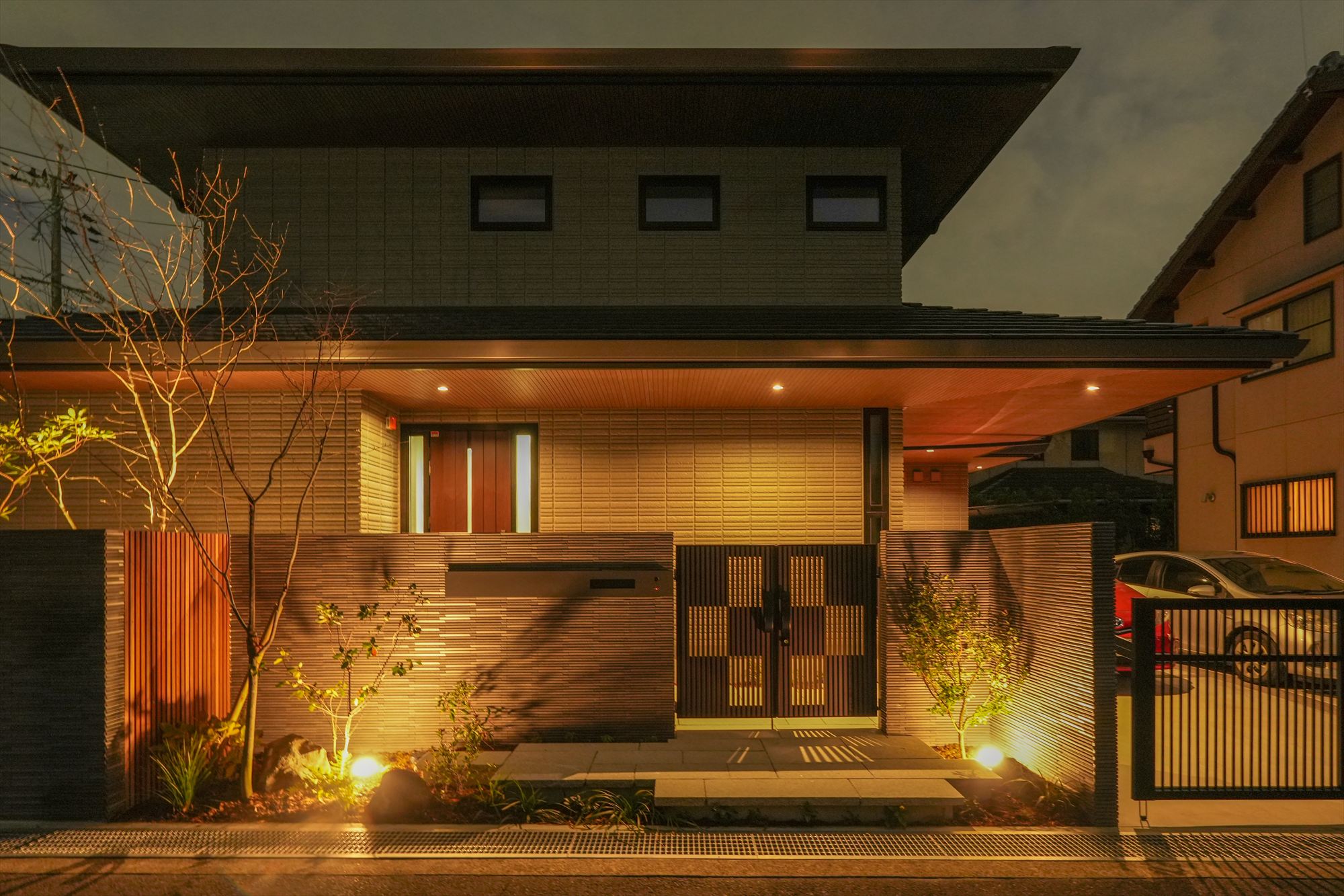 門扉まわりは格子デザインと間接照明を組み合わせ、外からの視線をやわらかく遮りながら、内へと招き入れる「間」を演出しています。
